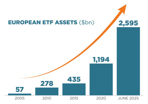 It took a long time for the European market to pick up on ETFs and by end 2010, assets had reached just $313bn. By 2019, ETF assets hit $1tn and since then have experienced double-digit compound annual growth. The latest figures for 2025 inflows show little sign of this growth slowing, with many market commentators bullish as to ETFs’ continued growth.